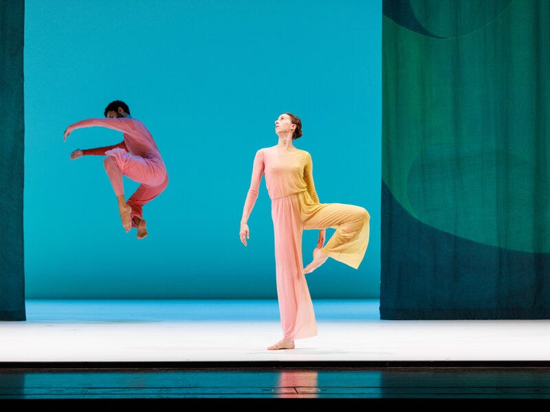 Pastoral beautifully evoked the senses: the lushness of a leafy, shaded forest, the freshness of morning dew. In the music, you could almost smell wet leaves, oaky moss, the damp earth after rain. The lighting was perfectly matched to the music, at times evoking the sweet warmth of sunset or the cool light of misty dawn. The dancers, too, felt light and ethereal. The brightly colored costumes, designed by Reid Bartelme, flow in translucent layers and fade in saturation across the body. My guest and I remarked that they resembled exotic birds, moving through their daily rituals together. There was a delicious languor to the piece, something akin to a déjeuner sur l’herbe. I wished I could have watched it outdoors, in a leafy glade, rather than inside a black box theater in the middle of winter.